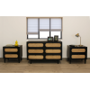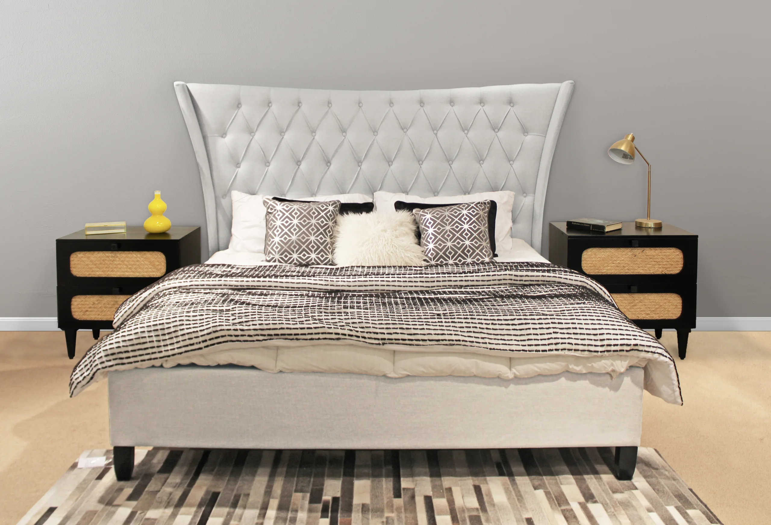 This 3-piece bedroom set exudes comfort and luxury. The king size bed is upholstered in limestone beige fabric, with a diamond quilted pattern on the headboard. Accenting this bed are two nightstands, woven with real cane. Many sweet dreams are sure to be had with this curated set.