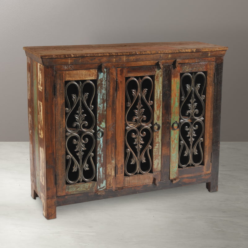 - Effortlessly blends functionality and style with 3 exquisitely-forged iron doors opening to interior shelved storage space