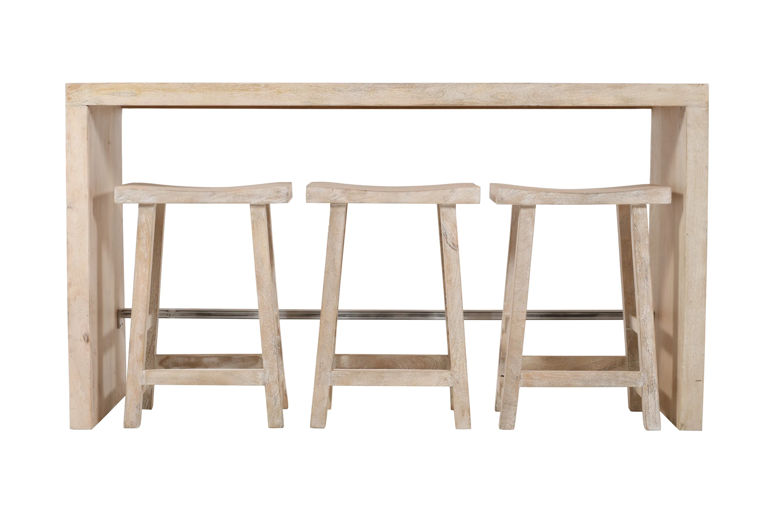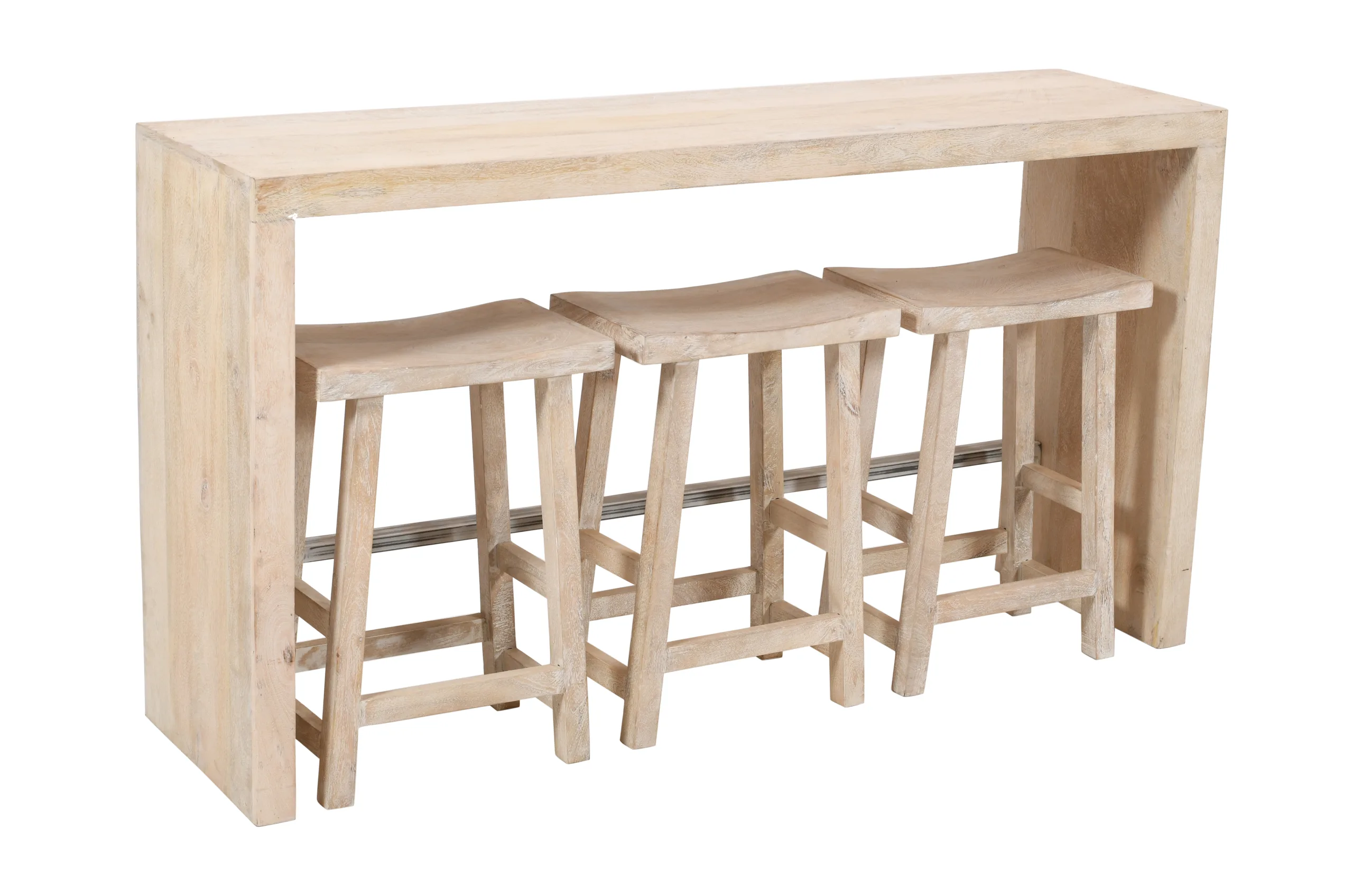 This 4-piece bar table and stools set will use its multi-dimensional quality to institute into the realm of transitional design and evoke elegance in any room with its presence. Featuring one counter-height bar table and three matching seating stools, each piece was hand crafted in India from beautiful kiln-dried solid mango wood and is finished in an antique-style brushed white.