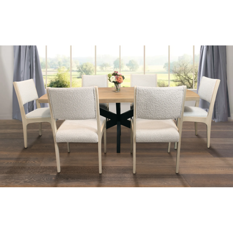 This dining set incorporates modern style onto a classic design. It includes one 82″ rectangular solid wood dining table on top of a pedestal base and ivory solid wood side chairs. This table is hand-distressed to bring out the natural wood grain finish. Each chair is made of solid wood and is upholstered in premium boucle fabric for a touch of class.