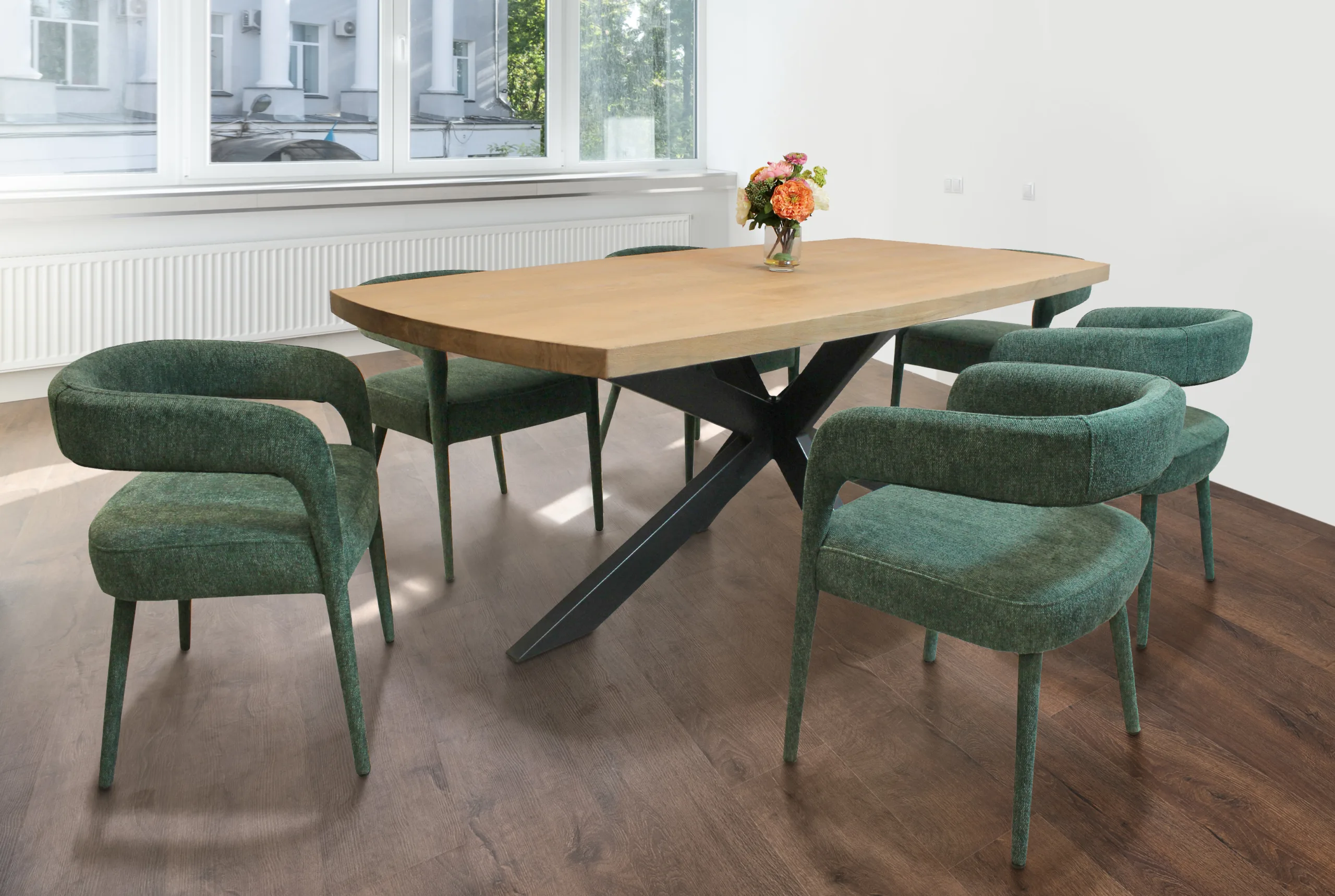This 6-person dining set ties together a modern style onto a classic design. It includes one 82″ rectangular solid wood dining table on top of a trestle base and 6 metal frame teal side chairs. This table is hand-distressed to bring out the natural wood grain finish. Each chair is upholstered in premium fabric for a touch of class.