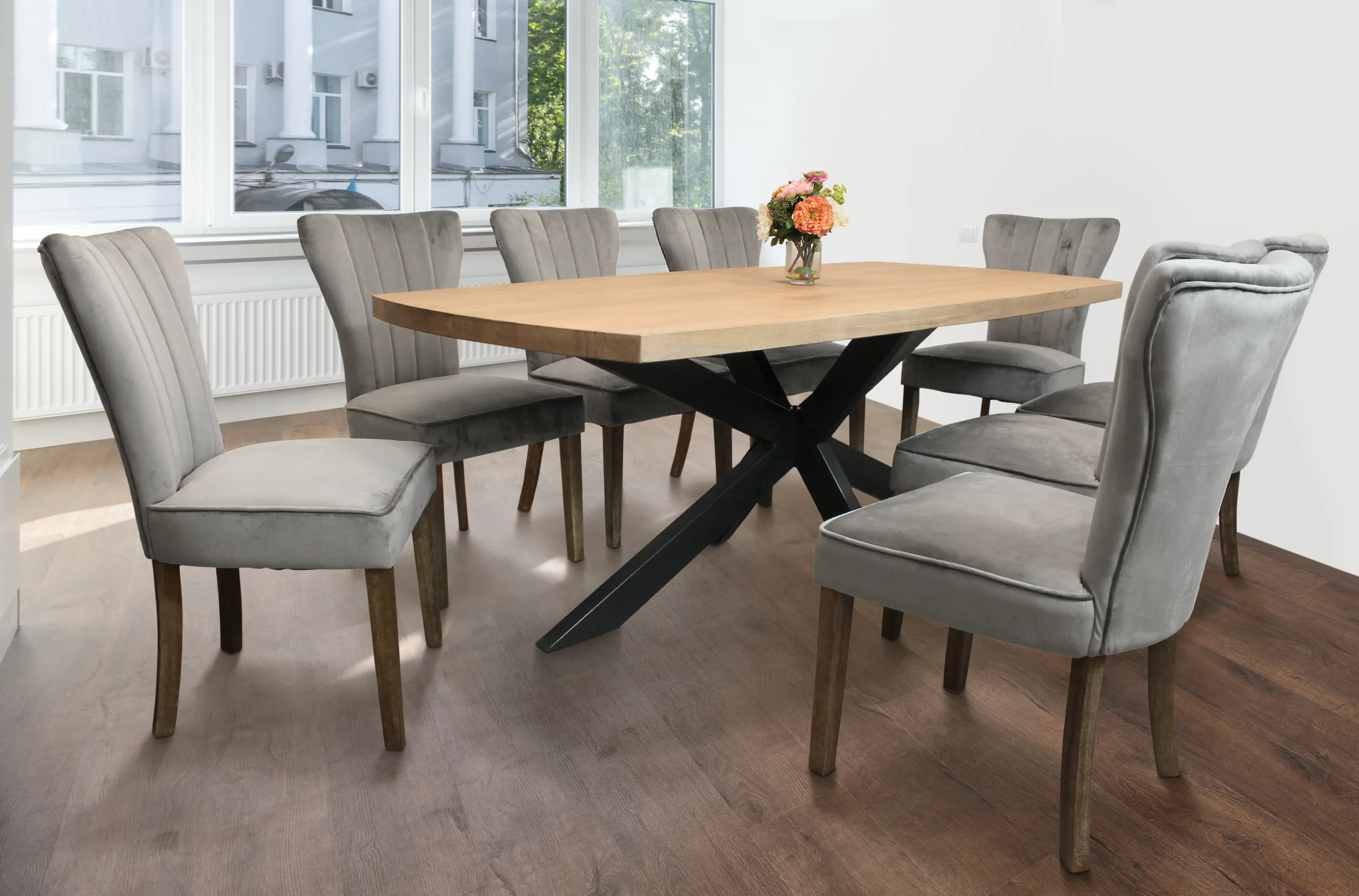 This dining set incorporates modern style onto a classic design. It includes one 82″ rectangular solid wood dining table on top of a pedestal base and mink solid wood side chairs. This table is hand-distressed to bring out the natural wood grain finish. Each chair is made of solid wood and is upholstered in premium velvet fabric for a touch of class.