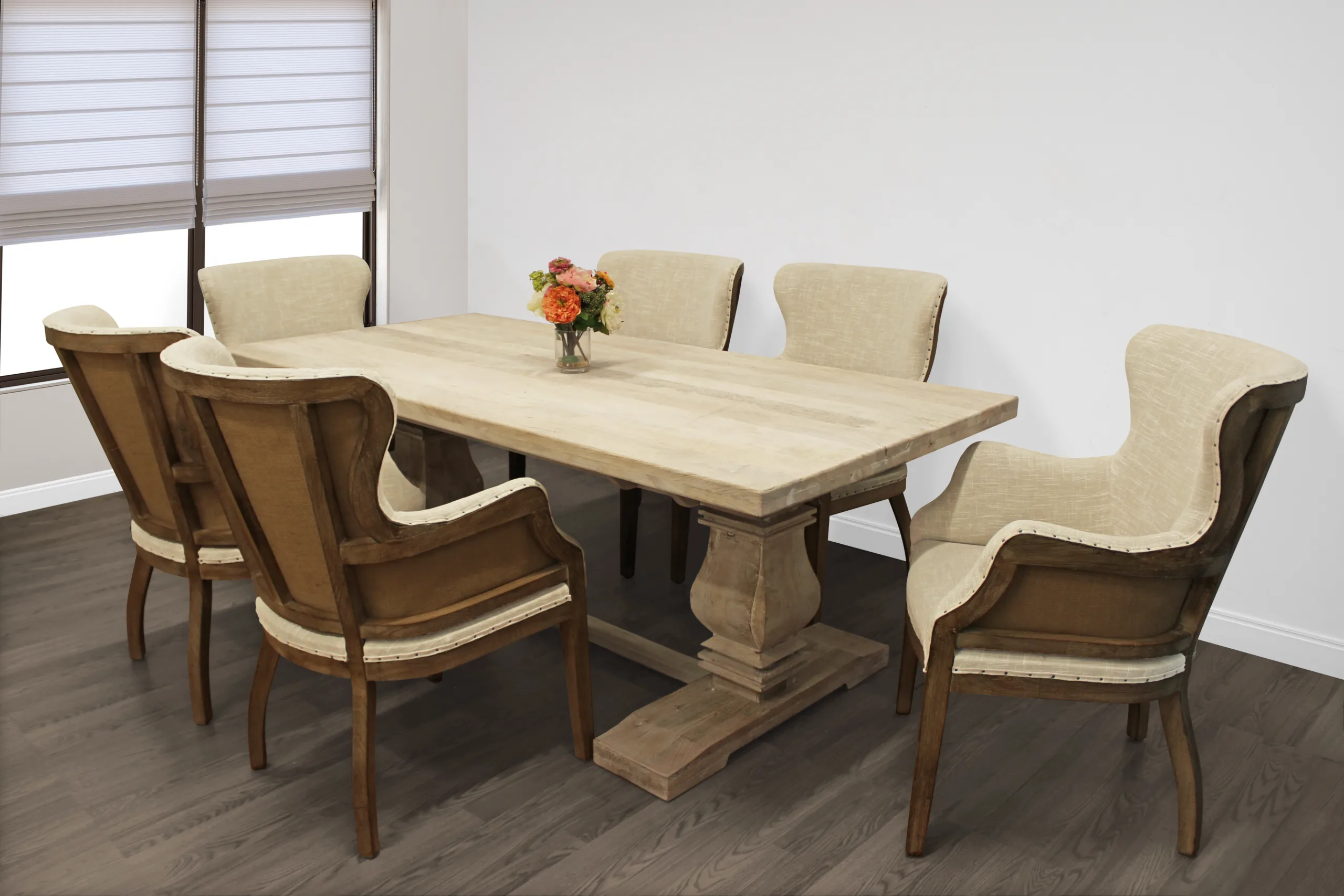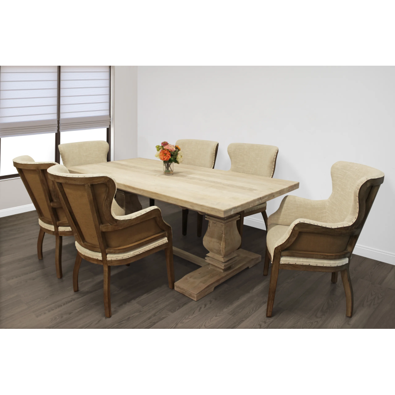 This 6-person dining set ties together traditional craftsmanship with an elegant modern twist. It includes one Solid wood extension dining table, and 6 natural linen upholstered side chairs. When fully extended this table expands up to 106″ with room for everyone at the table. This table is finished in a hand-rubbed white wash to bring out the natural wood grain variation. Each chair features solid wood legs and nailhead trim for a touch of class.