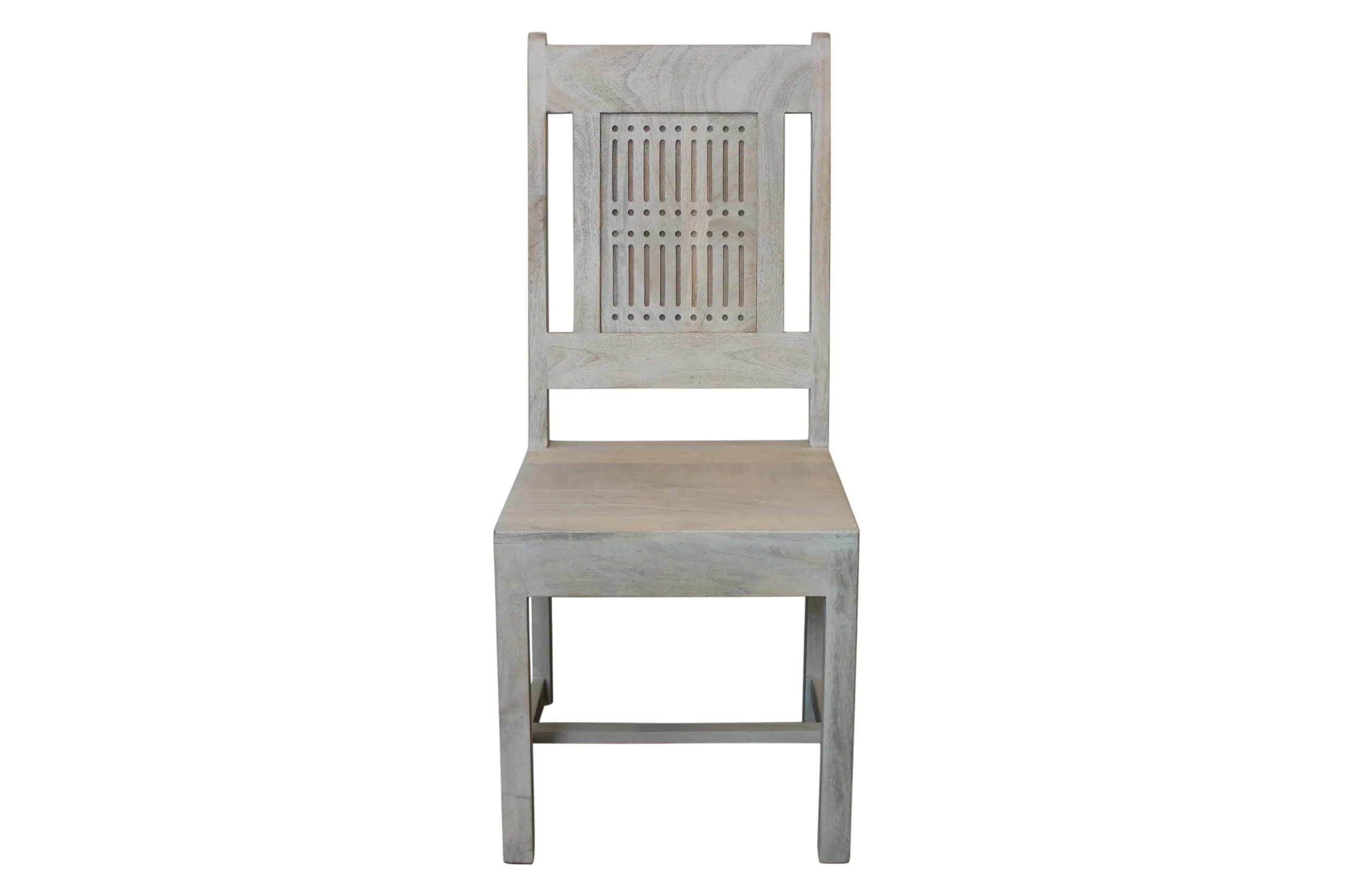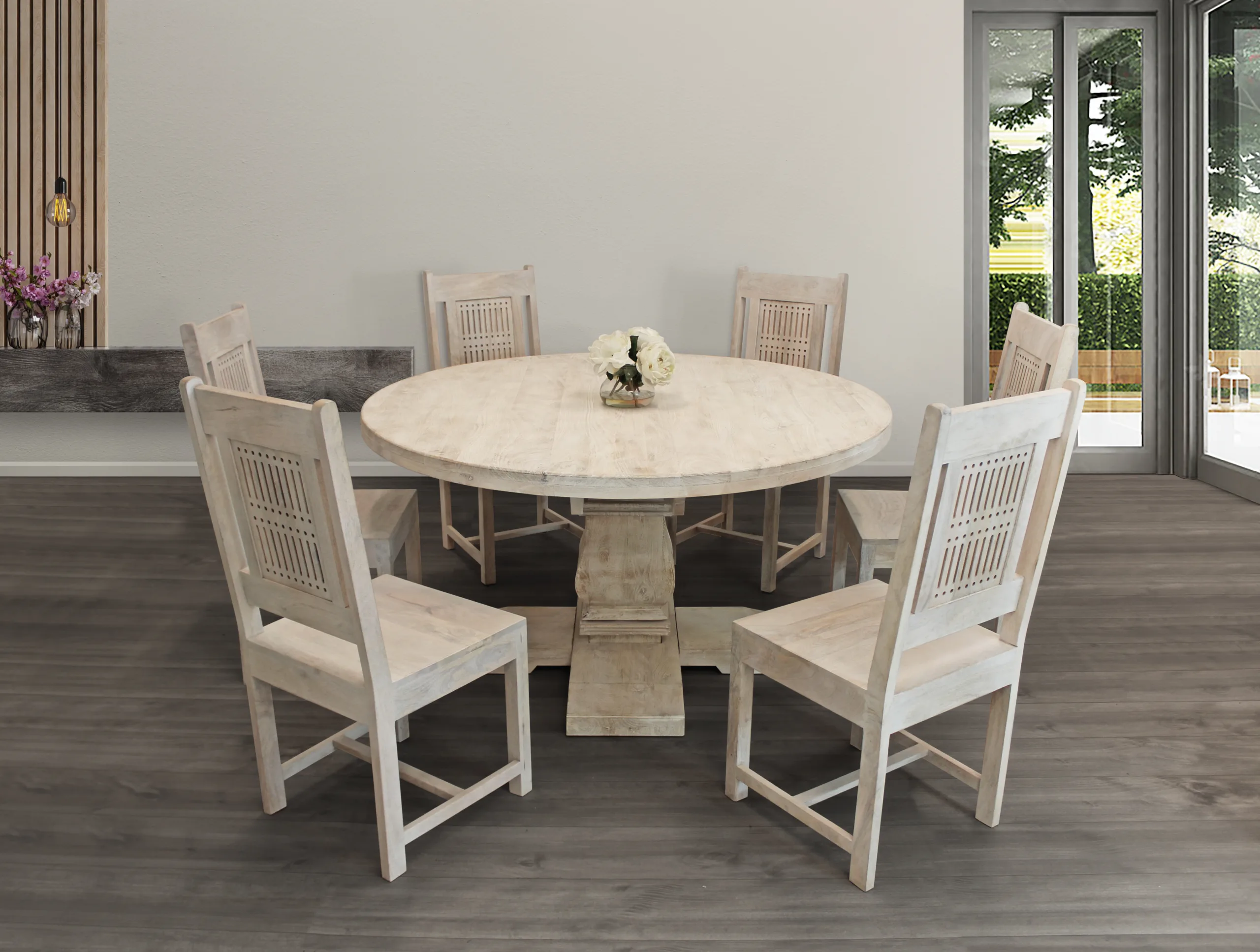 This 6-person dining set ties together traditional craftsmanship with an elegant modern twist. It includes one 58″ round solid wood dining table, and 6 solid mango wood side chairs. This table is finished in a hand-distressed white wash to bring out the natural wood grain variation. Each chair features a brushed ivory finish for a touch of class.