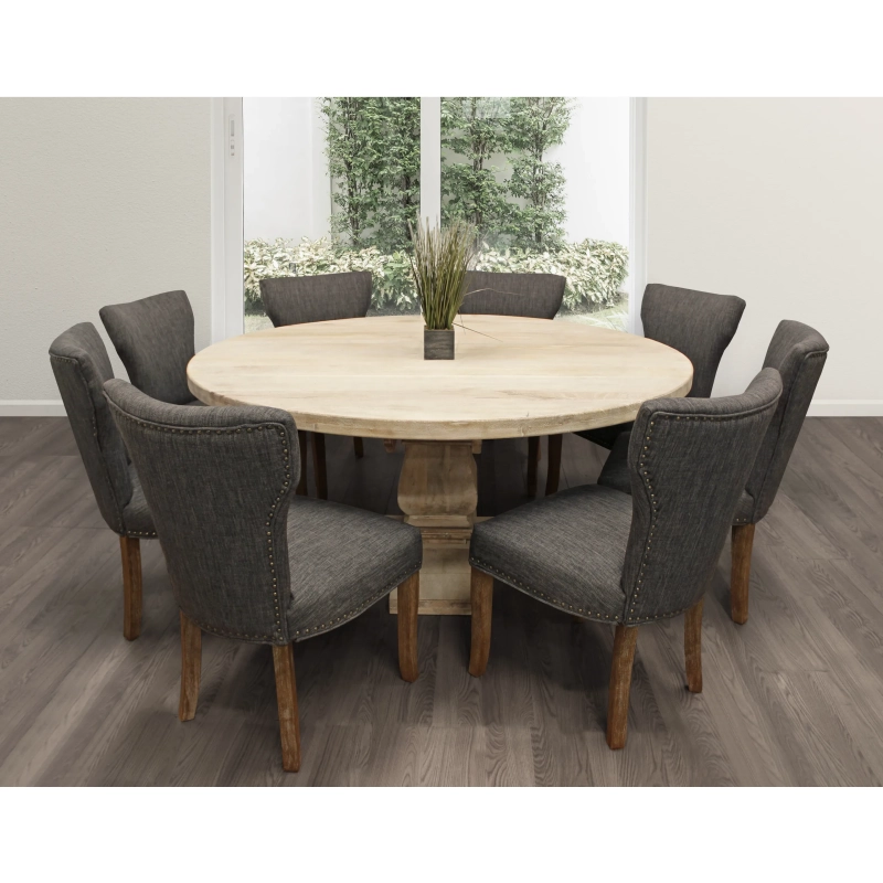This 8-person dining set ties together traditional craftsmanship with an elegant modern twist. It includes one 70″ round solid wood dining table, and eight ivory linen upholstered side chairs. This table is finished in a hand-distressed white wash to bring out the natural wood grain variation. Each chair features solid wood legs and nail head trim for a touch of class.