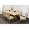 This 8-person dining set ties together traditional craftsmanship with an elegant modern twist. It includes one 81″ rectangular solid wood dining table and eight dark gray linen upholstered side chairs. This table is finished in a hand-distressed white wash to bring out the natural wood grain variation. Each chair features solid wood legs and nailhead trim for a touch of class.