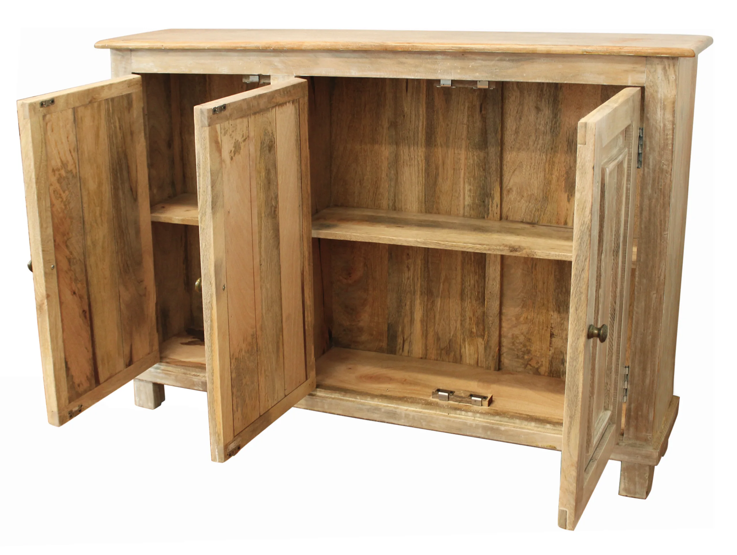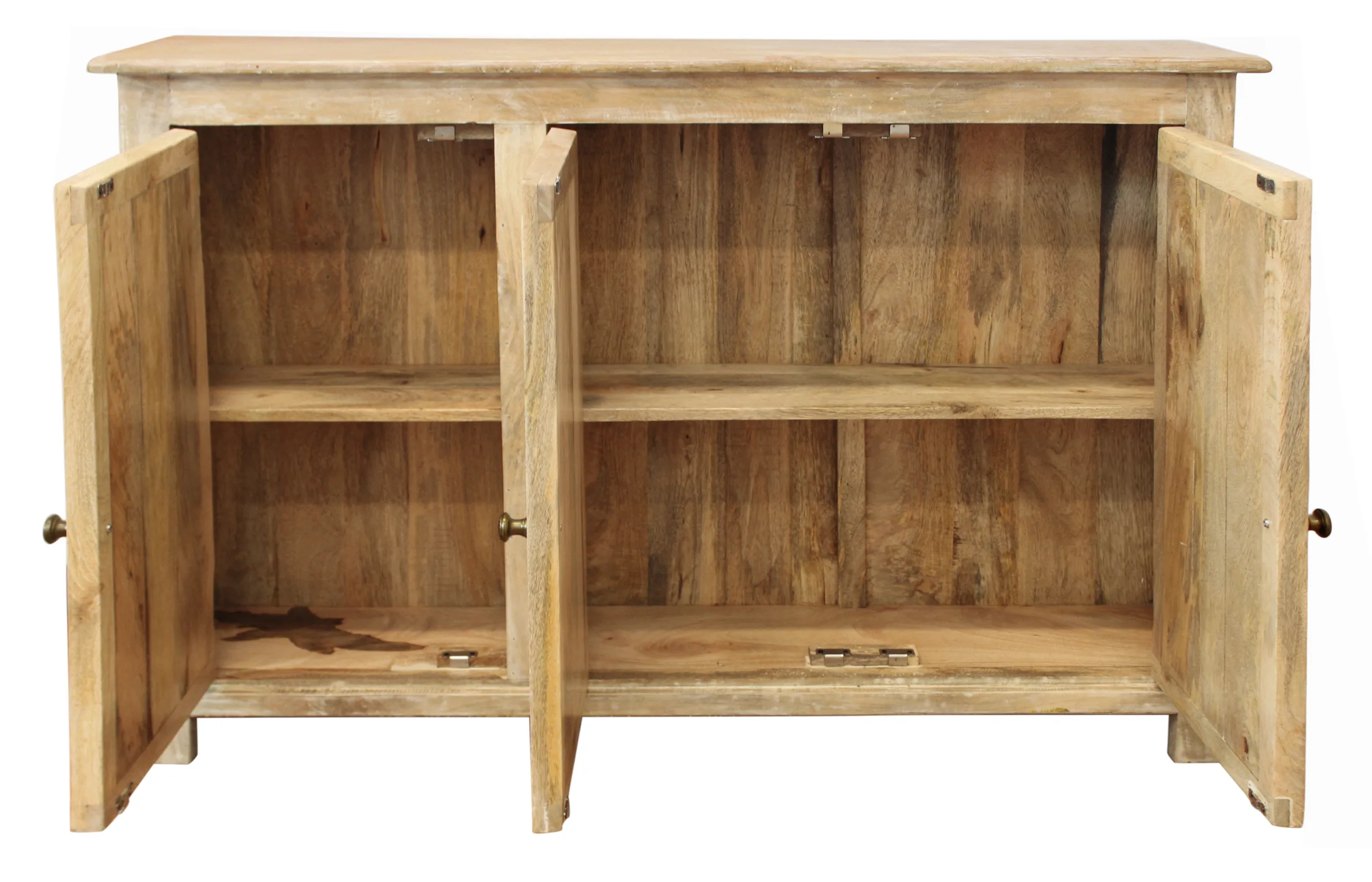 This Jenson 3-Door Sideboard is masterfully crafted in India from solid mango wood. Its solid wood frame provides confidence-inspiring strength and stability. The cabinet doors open to interior storage shelves, making this small sideboard a great addition for anyone aiming to keep their living spaces both organized and stylish. With a classic rectangular shape and beautiful natural finish, this piece blends seamlessly with a wide range of existing décor and design aesthetics.