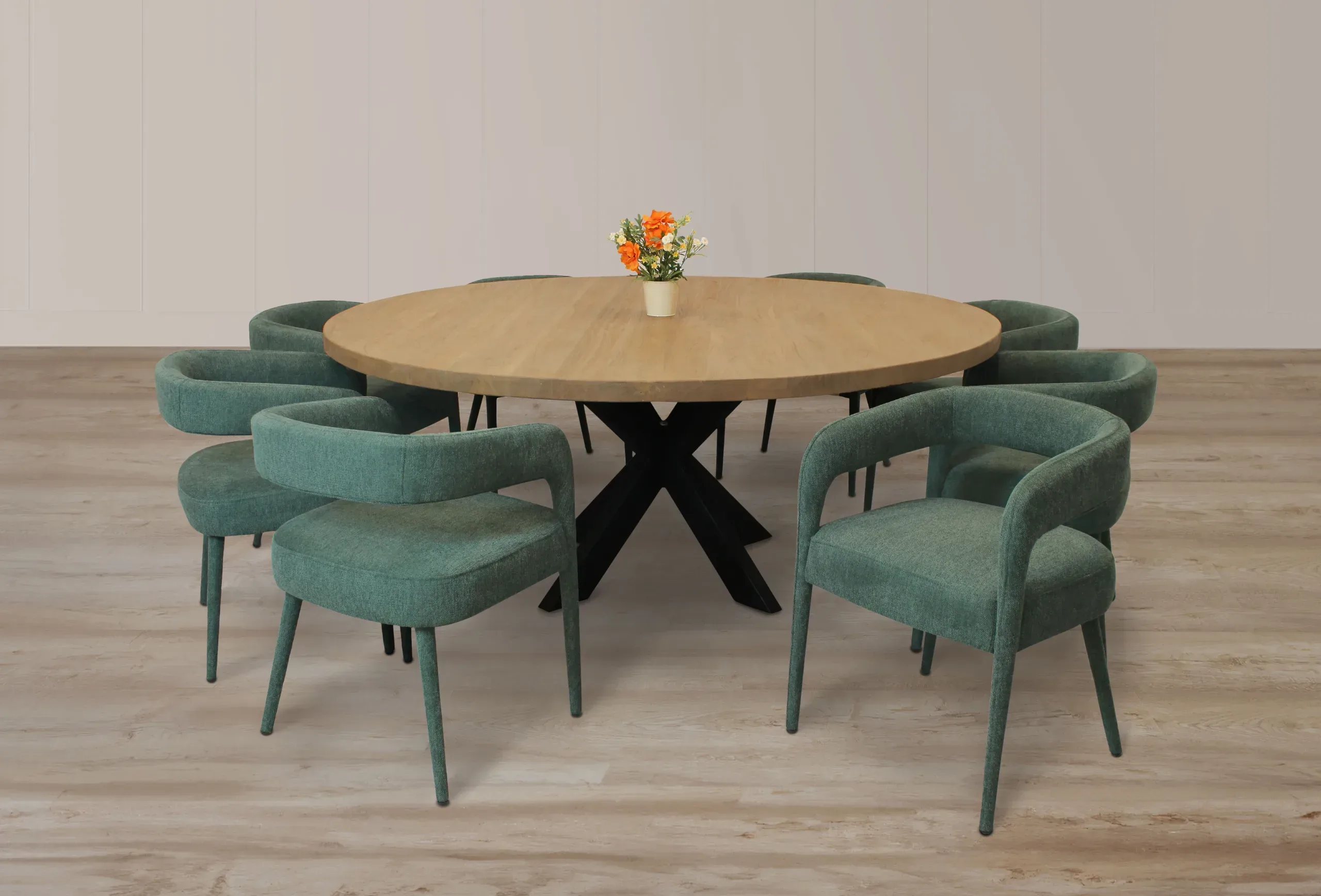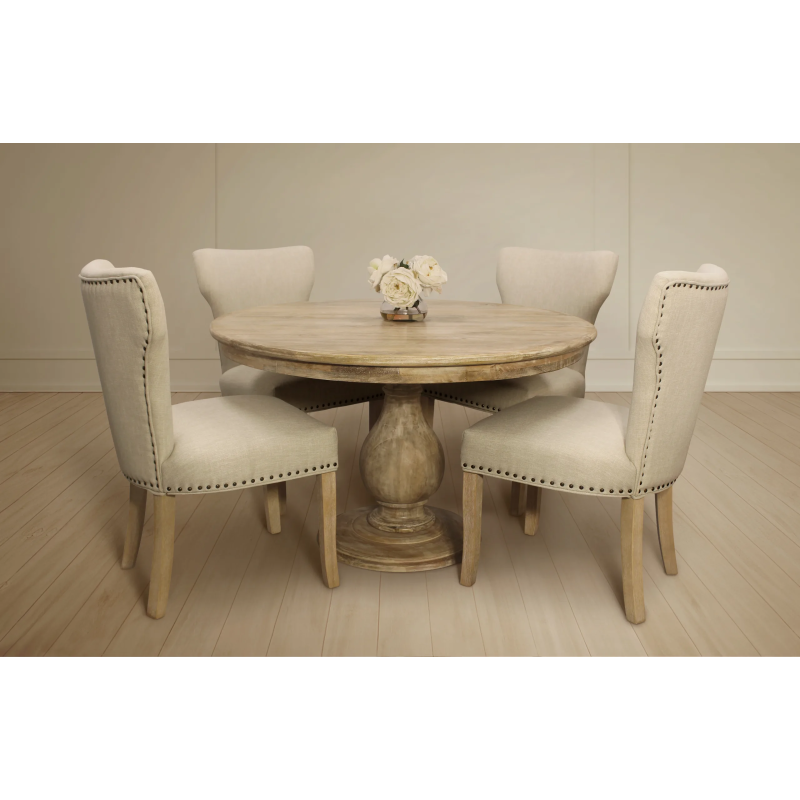 This beautiful five-piece dining set features our Jensen 48” Round Solid Wood Dining Table surrounded by four Ivory Howell Side Chairs. When brought together, the display is an eye-catching blend of hand-crafted clean, traditional lines. The dining table is masterfully crafted from solid kiln dried wood and comes in a natural finish. The chairs feature a solid wood frame and soft woven linen fabric in a classic ivory color. This set’s timeless design allows it to blend beautifully with existing décor and immediately infuse any dining space with an air of elegance.