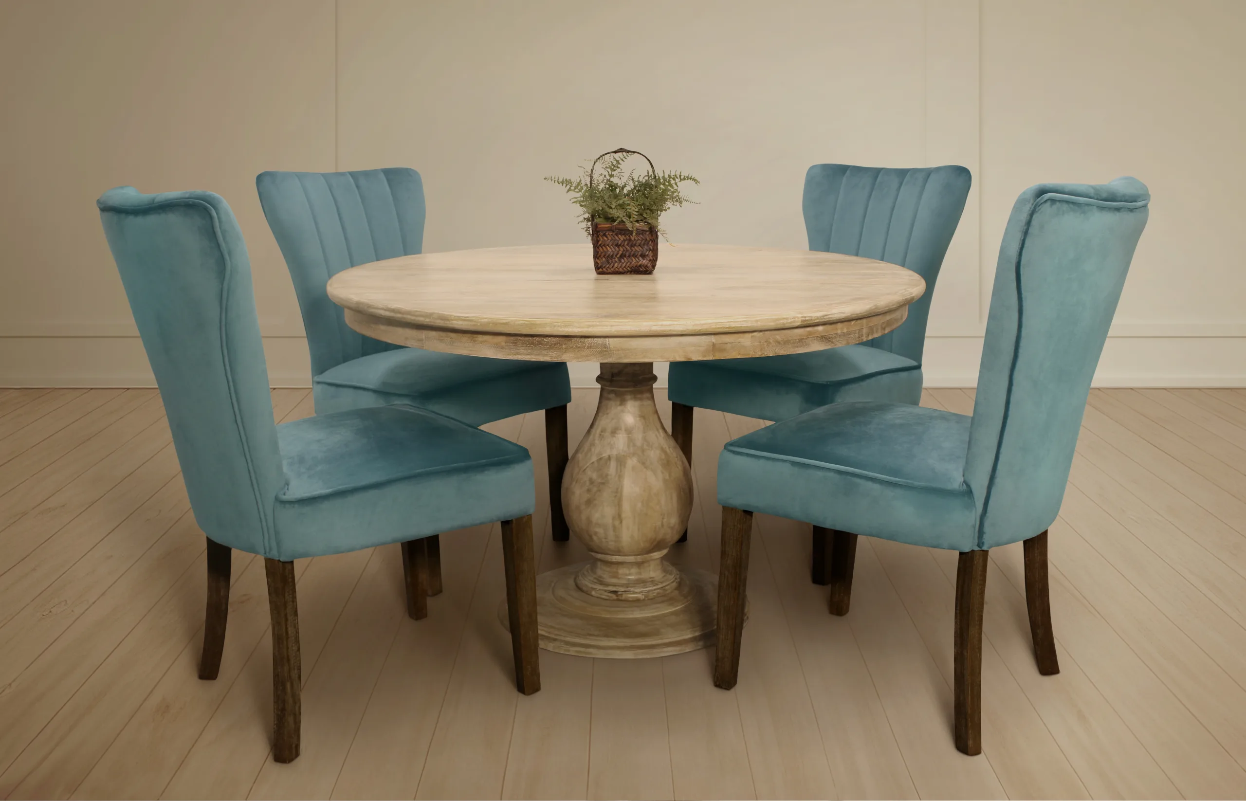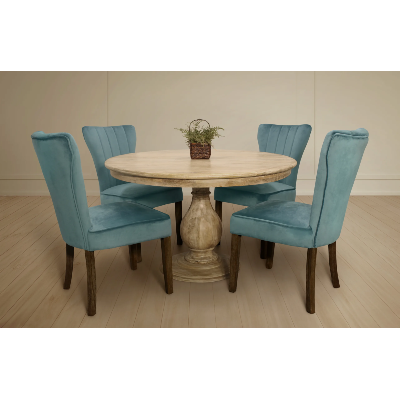 This beautiful five-piece dining set features our Jensen 48” Round Solid Wood Dining Table surrounded by four Teal Clive Side Chairs. When brought together, the display is an eye-catching blend of hand-crafted clean, traditional lines. The dining table is masterfully crafted from solid kiln dried wood and comes in a natural finish. The chairs feature a solid wood frame and velvet fabric in a classic teal color. This set’s timeless design allows it to blend beautifully with existing décor and immediately infuse any dining space with an air of elegance.