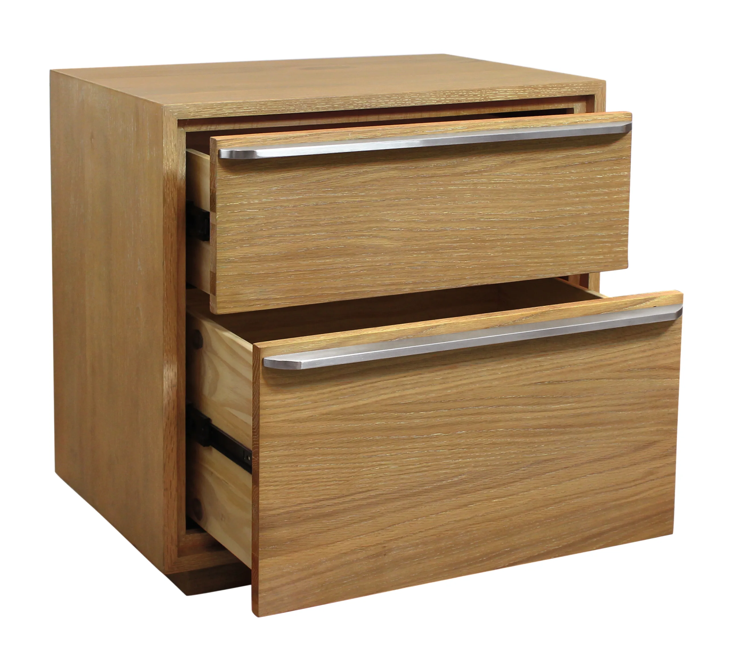 This beautiful oak wood nightstand includes sleek stainless steel handles and soft-close drawers for a modern twist on a classic silhouette. 2 large drawers provide ample room for storage, allowing bedrooms and living spaces to stay tidy and organized. Masterfully crafted in Vietnam, the piece arrives fully assembled for additional ease.