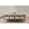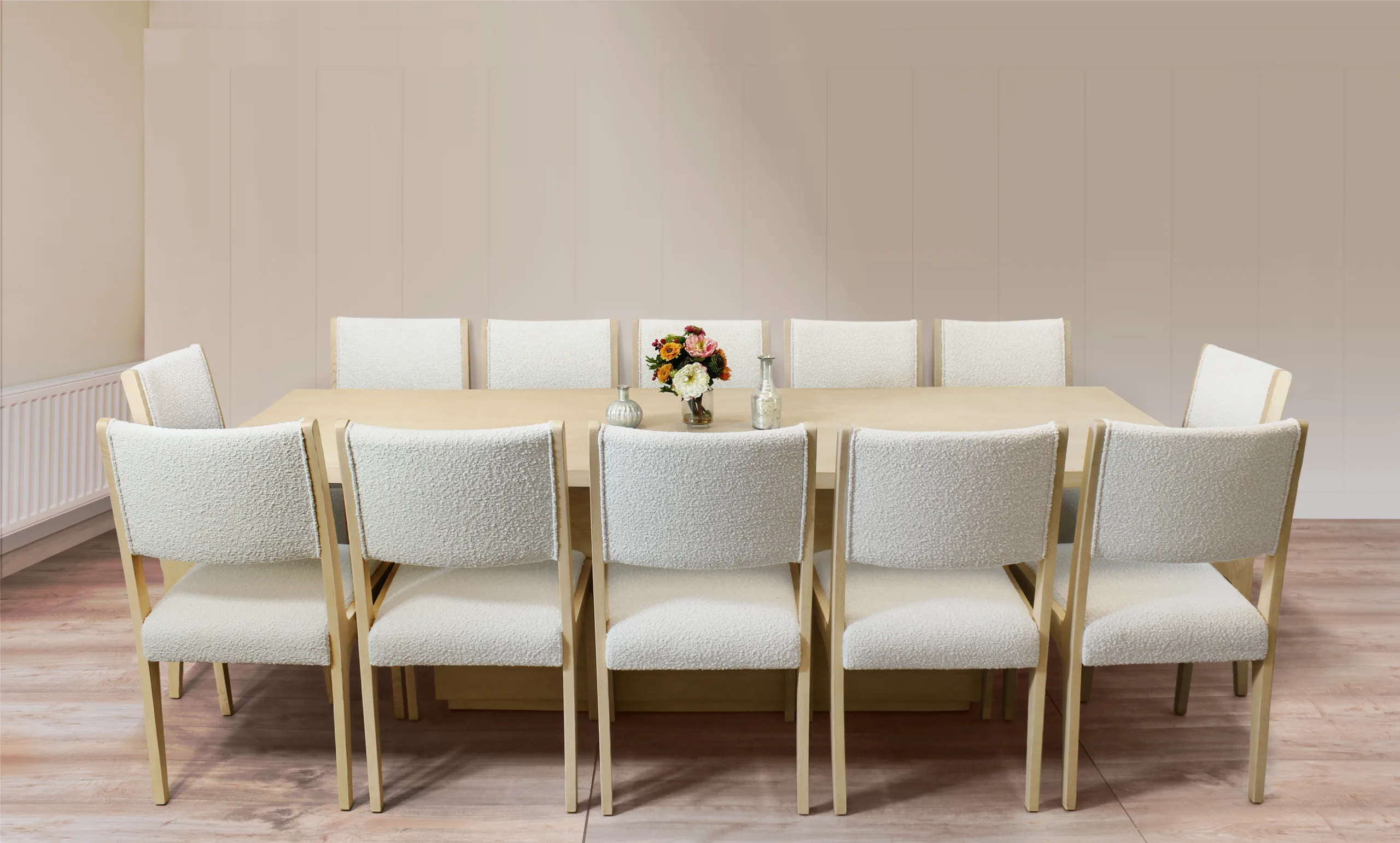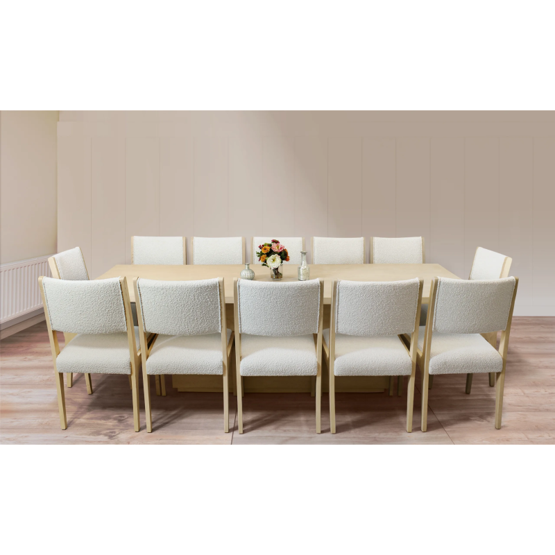 This 12-person dining set ties together traditional craftsmanship with an elegant modern twist. It includes one 108″ solid wood dining table, and 12 solid ash wood side chairs. This table features a hand-distressed stone natural finish to bring out the natural wood grain variation. Each chair is upholstered in premium boucle fabric for a touch of class.