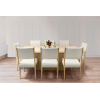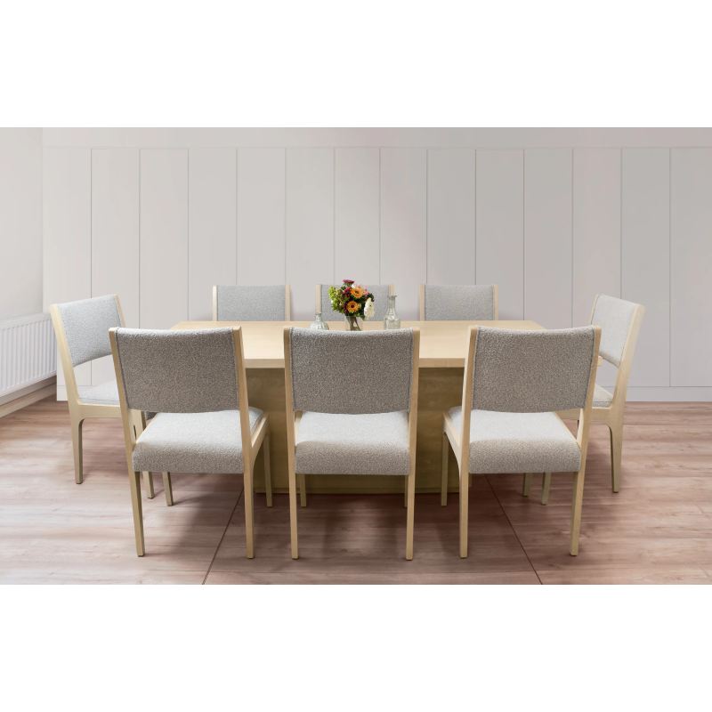 This 8-person dining set ties together traditional craftsmanship with an elegant modern twist. It includes one 84″ solid wood dining table, and 8 solid ash wood side chairs. This table features a hand-distressed stone natural finish to bring out the natural wood grain variation. Each chair is upholstered in premium boucle fabric for a touch of class.