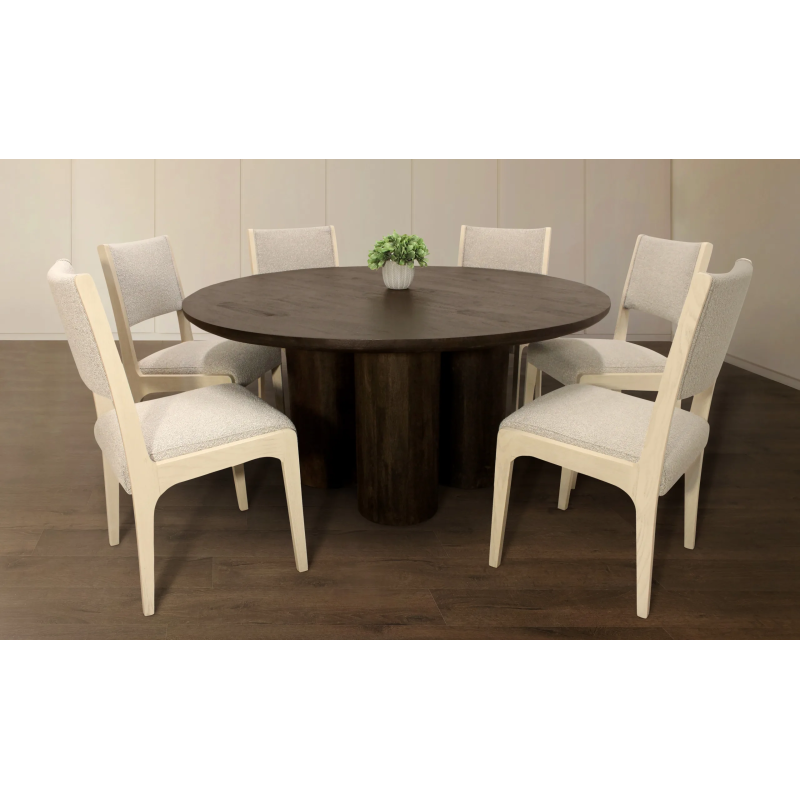 This beautiful five-piece dining set features our Syracuse 63″ Round Solid Wood Dining Table surrounded by four Silver Ashton Side Chairs. When brought together, the display is an eye-catching blend of hand-crafted clean, traditional lines. The dining table is masterfully crafted from solid kiln dried wood and comes in a natural finish. The chairs feature a solid wood frame and soft woven boucle linen fabric in a classic gray color. This set’s timeless design allows it to blend beautifully with existing décor and immediately infuse any dining space with an air of elegance.
