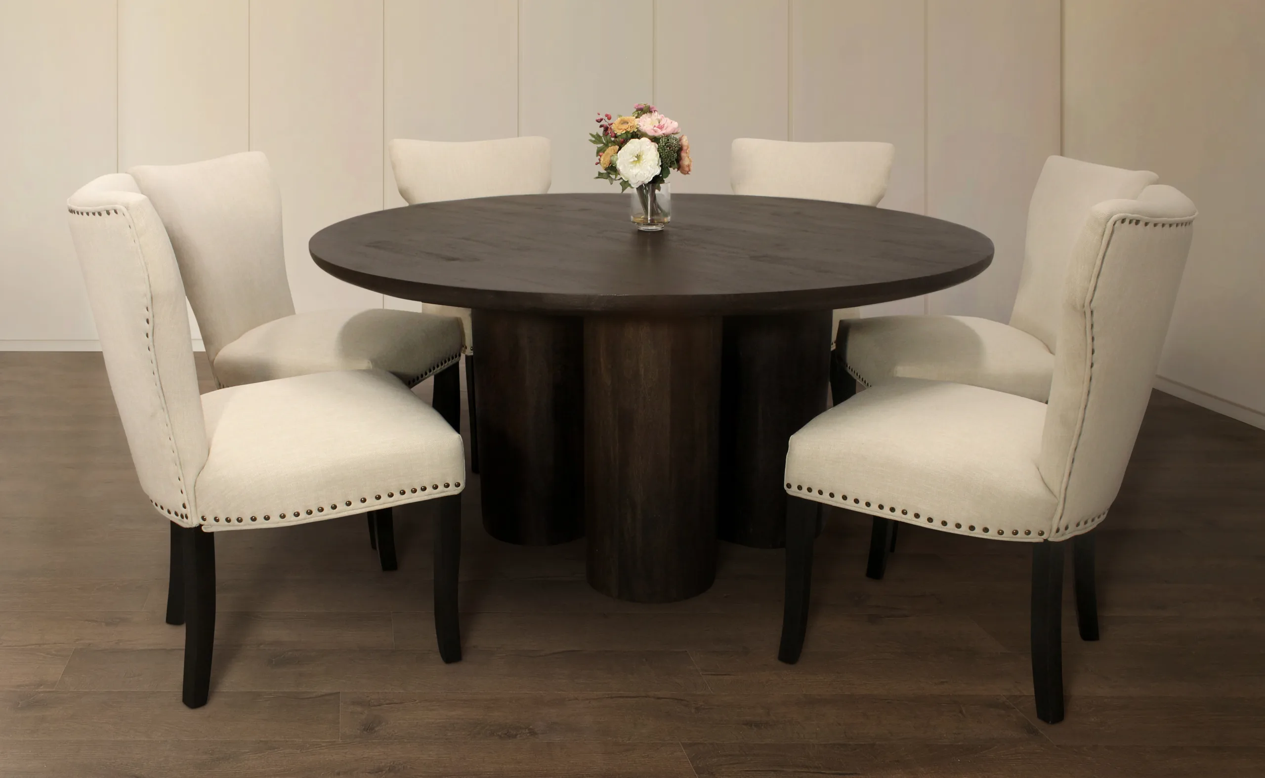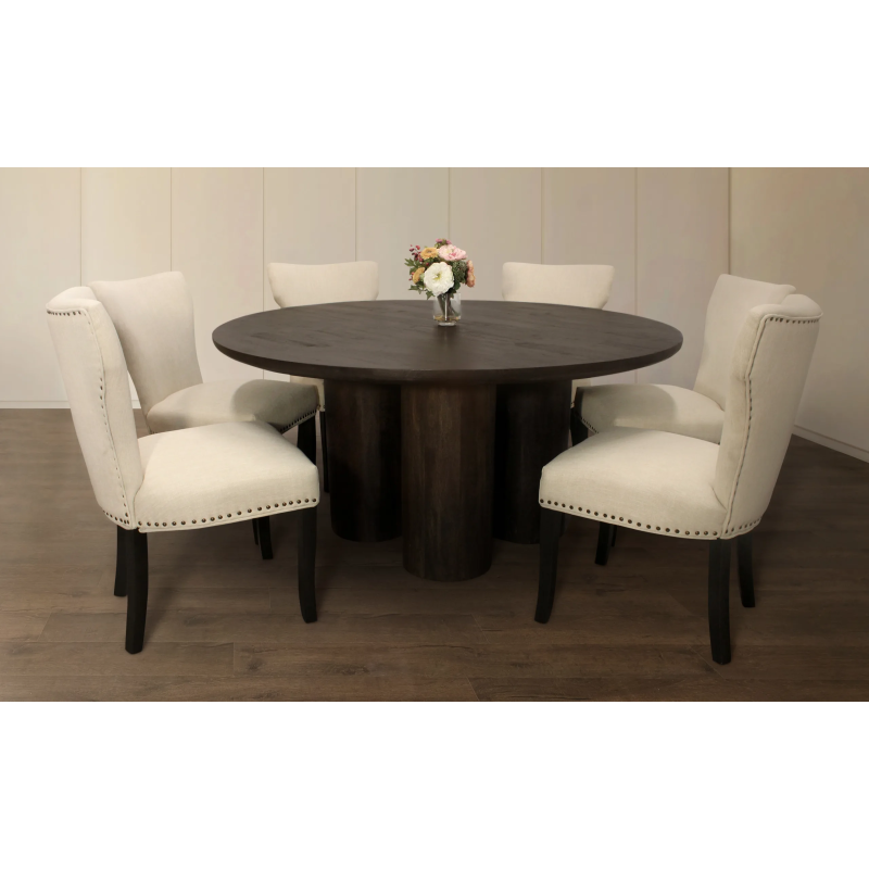 This beautiful five-piece dining set features our Syracuse 63″ Round Solid Wood Dining Table surrounded by four Natural Linen Howell Side Chairs. When brought together, the display is an eye-catching blend of hand-crafted clean, traditional lines. The dining table is masterfully crafted from solid kiln dried wood and comes in a natural finish. The chairs feature a solid wood frame and soft woven linen fabric in a classic natural color. This set’s timeless design allows it to blend beautifully with existing décor and immediately infuse any dining space with an air of elegance.