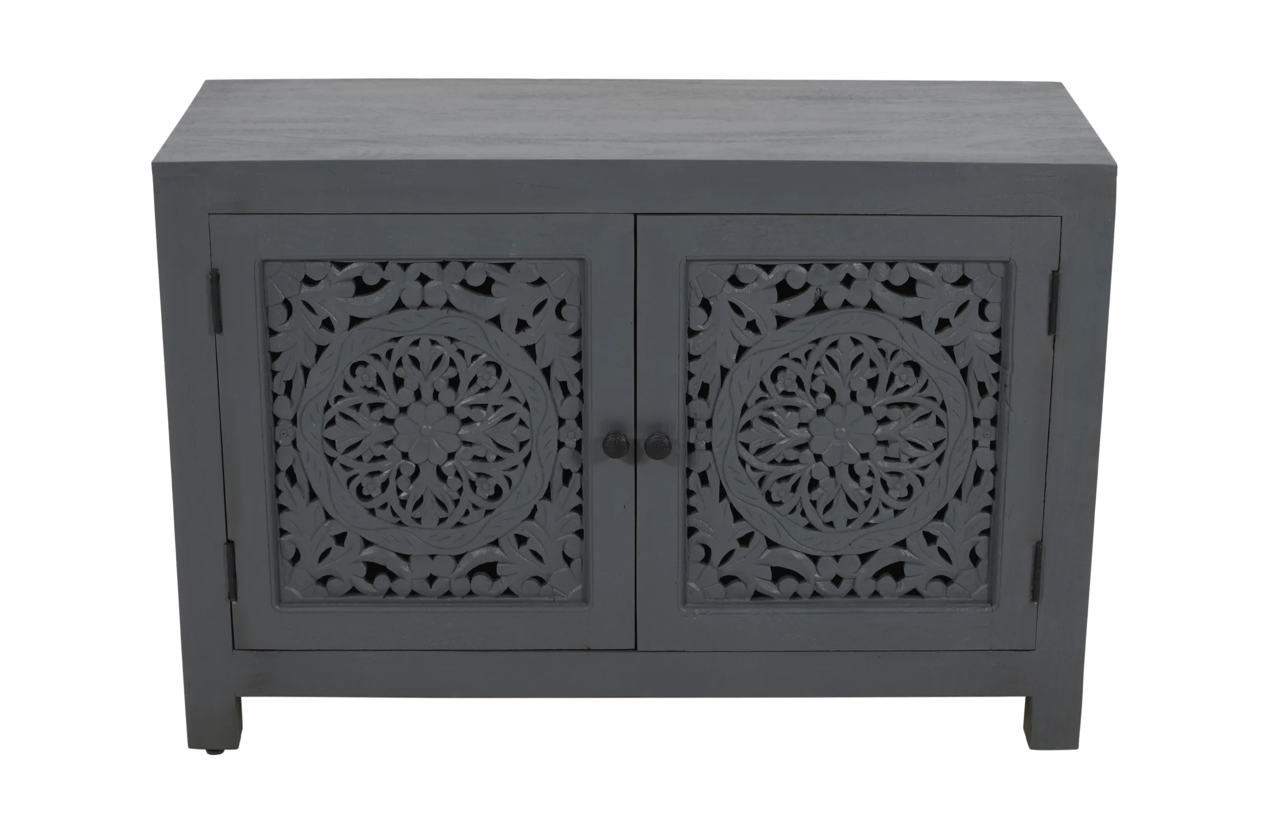 This beautiful 2-door accent cabinet brings a touch of coastal boho elegance to any living space. Masterfully crafted from solid mango wood, the cabinet’s two hand-carved doors open to a spacious interior shelf, allowing for convenient-yet-chic storage that helps maintain a clutter-free lifestyle. Crafted in India, this piece is finished in a timeless charcoal gray for an additional air of sophistication.